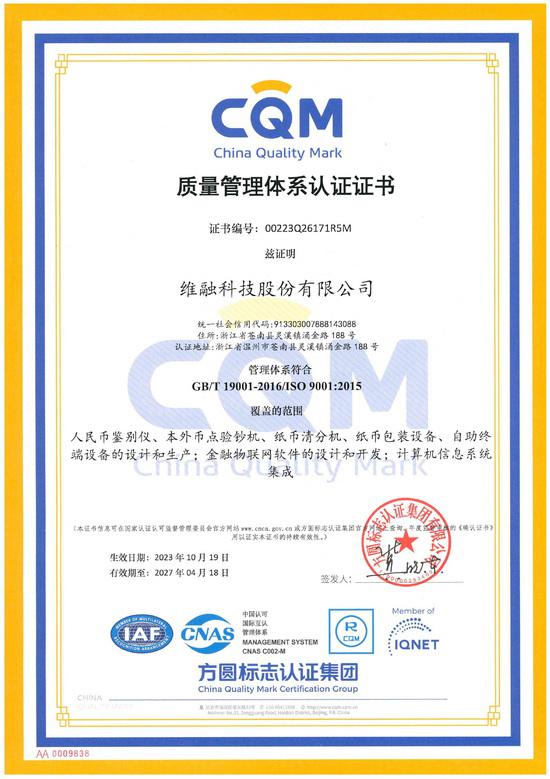 環(huán)境管理體系CQM認證證書