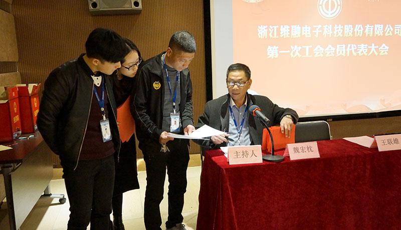 大會(huì)在雄壯的《中華人民共和國(guó)國(guó)歌》聲中隆重開幕。主持人宣讀了浙江蒼南工業(yè)園區(qū)總工會(huì)有關(guān)批復(fù)文件,工會(huì)籌備組代表李秩明作籌備工作報(bào)告,通過(guò)了第一次工會(huì)會(huì)員代表大會(huì)選舉辦法。會(huì)議依照《工會(huì)法》、《中國(guó)工會(huì)章程》采取差額選舉的辦法,經(jīng)過(guò)公平、公正、公開的無(wú)記名投票,選舉李秩明、蔡增弟、魏舜軍、楊素葉、張欽樂(lè)、陳宣總、魏小蘭為維融科技股份有限公司第一屆工會(huì)委員會(huì)委員,魏舜軍、倪麗義、陳登婕為工會(huì)經(jīng)審委委員,蔡增弟、馬長(zhǎng)虹、羅玲為女職委委員;隨后召開的維融股份第一屆工會(huì)委員會(huì)、工會(huì)經(jīng)費(fèi)審查委員會(huì)、女職工委員會(huì)會(huì)議中選舉李秩明同志為工會(huì)主席、蔡增弟同志為副主席;選舉魏舜軍同志為經(jīng)費(fèi)審查委員會(huì)主任、蔡增弟同志為女職工委員會(huì)主任。