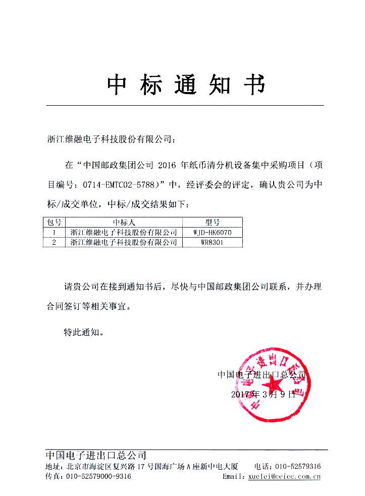 近日,我公司收到中國電子進出口總公司發(fā)出的《中標通知書》。在中國郵政集團公司2016年紙幣清分機設備集中采購項目(項目編號:0714-EMTC02-5788)中,經評標委員會的評定,確認維融科技股份有限公司為中標單位,入圍產品為1+1口紙幣清分機、2+1口紙幣清分機。